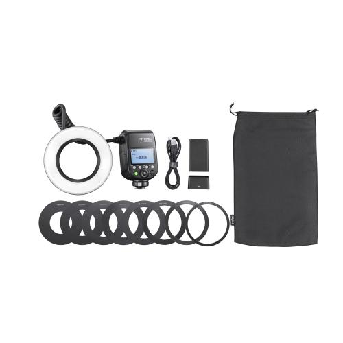 1x Flash circular macro 1x Carregador USB 8x Anéis adaptadores 1x Bolsa de transporte 1x Bateria Godox WB100 1x Cabo de carregamento USB Tipo-C