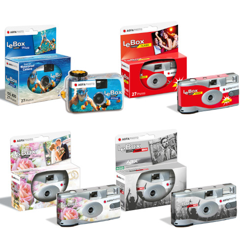Rolos de filme analógicos, câmaras descartáveis e câmaras fotográficas analógicas