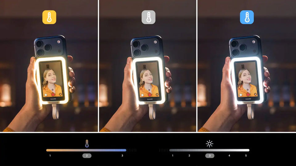 Desenvolvido em colaboração com a AMIRO, o Selfie Screen with Light oferece 3 cores e 5 níveis de luminosidade. Suaviza as sombras e as imperfeições para que consiga obter uma tez radiante, mesmo com pouca luz.