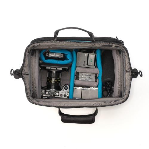 A Cineluxe v2 Shoulder Bag 16 acomoda câmaras mirrorless ou DSLR com 3 a 5 objetivas, ou câmaras de vídeo profissionais e câmaras de cinema compactas. Cumpre os regulamentos internacionais de bagagem de mão e cabe até debaixo do assento de um avião. Esta mala é compacta, leve e fácil de transportar, e a sua altura interior permite guardar câmaras com microfones e outros acessórios acoplados.